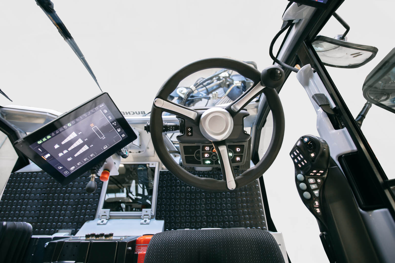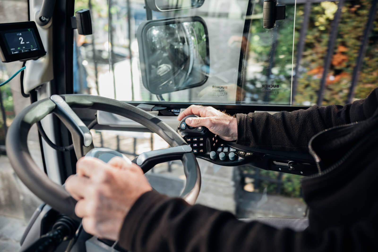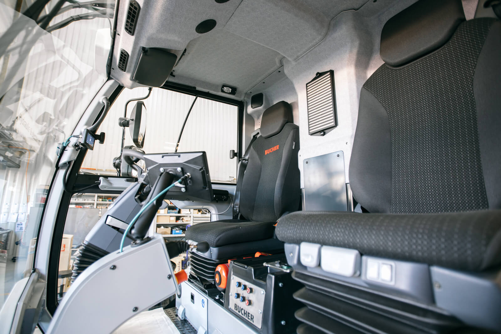 A cabine totalmente redesenhada com todas as luzes LED, sistema de travamento central e vidro em toda a volta oferece ao operador o máximo de conforto e segurança, proporcionando um local de trabalho moderno. O Bucher CityCat VR50e é operado por meio do sistema operacional Smart-Con projetado ergonomicamente e operado com uma mão. A tela de toque CSense inclui todas as ferramentas operacionais adicionais, eliminando os interruptores desnecessários na cabine, deixando o motorista concentrado no trabalho que tem pela frente.