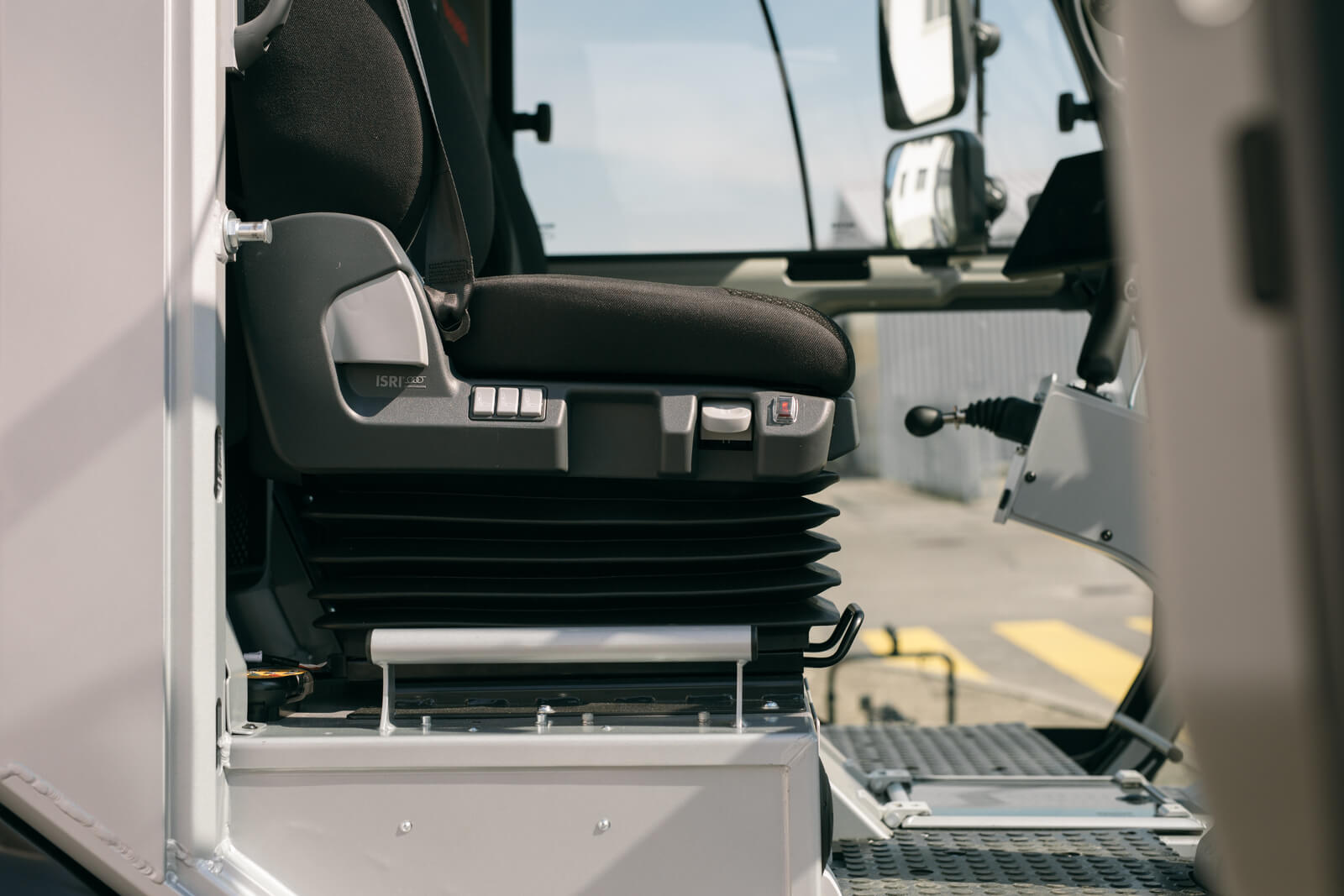 Acreditamos que todos os motoristas devem gostar de trabalhar com nossas varredoras, por isso apresentamos uma cabine de passagem, direção de toque suave e um apoio de braço com controles ergonomicamente aperfeiçoados. Uma excelente visão fora da cabine não é fornecida apenas pela grande tela frontal aquecida e todas as portas de vidro, mas também pelas opções de câmera, cujas visualizações podem ser exibidas nas telas Smart-Con e CSense.